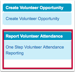 In Salesforce Classic: On the left sidebar, you'll see a widget named "Report Volunteer Attendance" Click on the link "One Step Volunteer Attendance Reporting" to launch the new one-step attendance reporting page.