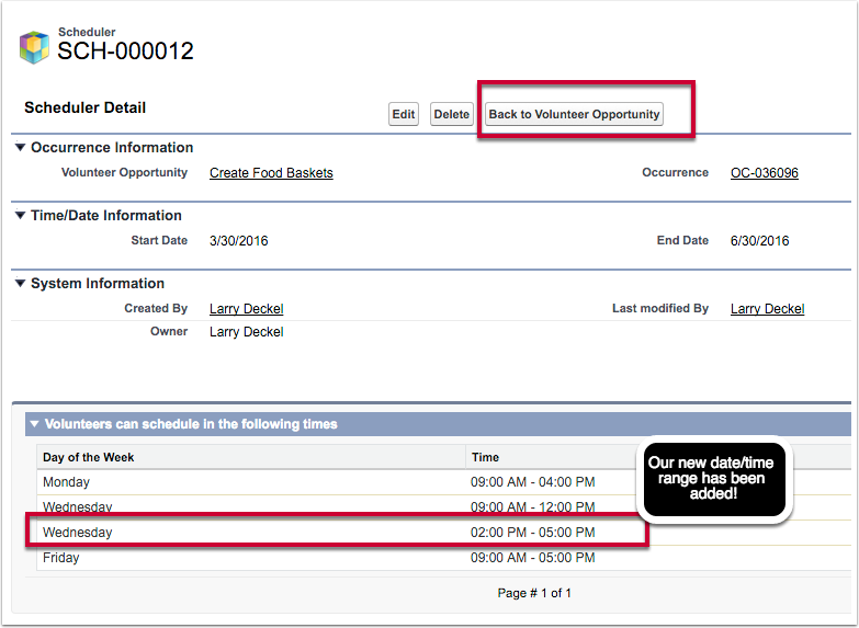Click on "Back to Volunteer Opportunity" to go back to the Volunteer Opportunity record.
