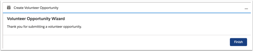 Use the "Create Volunteer Opportunity" link in the left sidebar to create a new volunteer opportunity (classic), or the "Create Volunteer Opportunity" in the utility bar (SF Lightning)